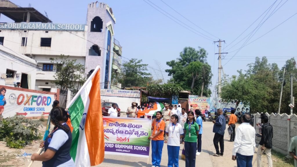 చర్లపల్లి, ఏప్రిల్ 1(ప్రజాక్షేత్రం):కాప్రా సర్కిల్ పరిధిలోని చర్లపల్లి డివిజన్లో ఆక్స్ఫర్డ్ పాఠశాల యాజమాన్యం జాతీయ పతాక ఆవిష్కరణ దినోత్సవాన్ని ఘనంగా నిర్వహించింది. పాఠశాల ప్రాంగణంలో ఏర్పాటు చేసిన 1000 అడుగుల పొడవైన జాతీయ పతాకాన్ని ముఖ్య అతిథులు ఆవిష్కరించారు. ఈ సందర్భంగా విద్యార్థులు జాతీయ గీతాన్ని ఆలపించి దేశభక్తి భావాలను వ్యక్తపరిచారు. అనంతరం విద్యార్థులు, ఉపాధ్యాయుల ఆధ్వర్యంలో భారీ ర్యాలీ నిర్వహించారు. చేతుల్లో జాతీయ జెండాలు, ప్లకార్డులు పట్టుకుని “జై హింద్”, “వందే మాతరం” నినాదాలతో వీధుల్లో ప్రదర్శనగా సాగారు. పరిసర ప్రాంతాలు దేశభక్తి వాతావరణంతో మార్మోగాయి. పాఠశాల నిర్వాహకులు మాట్లాడుతూ చిన్న వయస్సు నుంచే విద్యార్థుల్లో దేశభక్తి, క్రమశిక్షణ, సామాజిక బాధ్యతలపై అవగాహన పెంపొందించాల్సిన అవసరం ఉందన్నారు. దేశాభివృద్ధికి యువత ముందుకు రావాలని పిలుపునిచ్చారు.